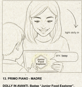 Lo spettatore diventa parte del racconto: il bambino funge da alter ego e il badge finale introduce un elemento ludico che genera empatia e partecipazione.
